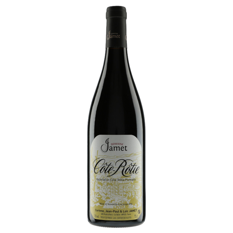 Le “Côte-Rôtie” du Domaine Jamet est issu d'une mosaïque de 25 parcelles, majoritairement en Côte Brune. Assemblage de 95 % Syrah et 5 % Viognier. Vinification en grappes entières majoritairement, fermentation en levures indigènes. Élevage de 22 mois en fûts (15 % de bois neuf).