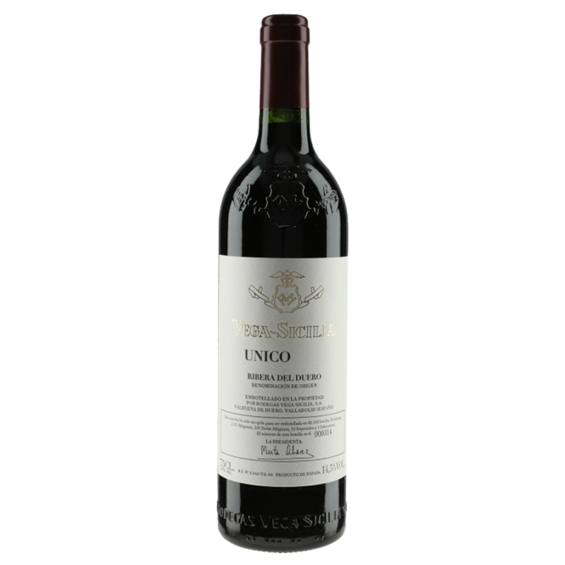 Au cœur de la Ribera del Duero, la légendaire cuvée “Vega Sicilia Unico” est issue du cépage roi Tinto Fino (ou Tempranillo), ici complété par du Cabernet Sauvignon. Parcelles légèrement pentues sur des sols de quartz, calcaires, cailloux et sables. Fermentation en cuve inox et élevage en fûts neufs de chênes français et américains (75%-25%). Élevage de 10 ans entre la cuve, le bois et la bouteille !