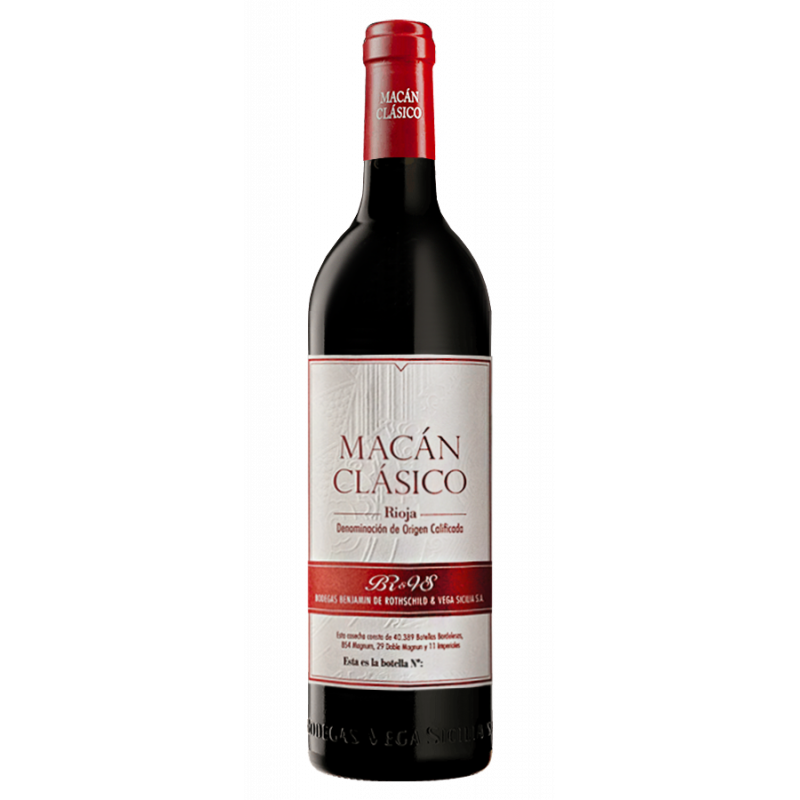 Implantées à l’Ouest, les parcelles du vignoble de Vega Sicilia et Rothschild se situent dans les meilleurs terroirs de la Rioja : “Rioja Alta” et “Rioja Alavesa”. L’influence Atlantique apporte de la fraîcheur dans les vignes et favorise une maturation plus lente et plus douce du cépage Tinto Fino (Tempranillo). Les sols sont composés à 90% d’argile et de calcaire et de 10% d’un sol argilo-ferreux. "Macan Clasico", entrée de gamme du Domaine, est un pur Tinto Fino (ou Tempranillo), fermenté en cuve et élevé entre 12 et 14 mois en fûts de chêne français neufs d’un vin.
