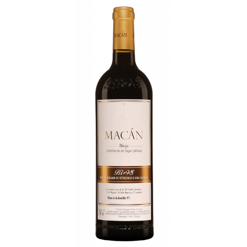 Les cuvées « Macán » et « Macán Clásico » constituent la vision conjointe de deux grands noms du vin Espagnol et Français : Rothschild et Vega Sicilia. Cuvée phare de la collaboration, issue d'une sélection de vieilles vignes sur les meilleurs terroirs de San Vicente. Fermentation en cuve inox et élevage en fûts français grain fin et extra fin pendant 12 mois (bois neuf).